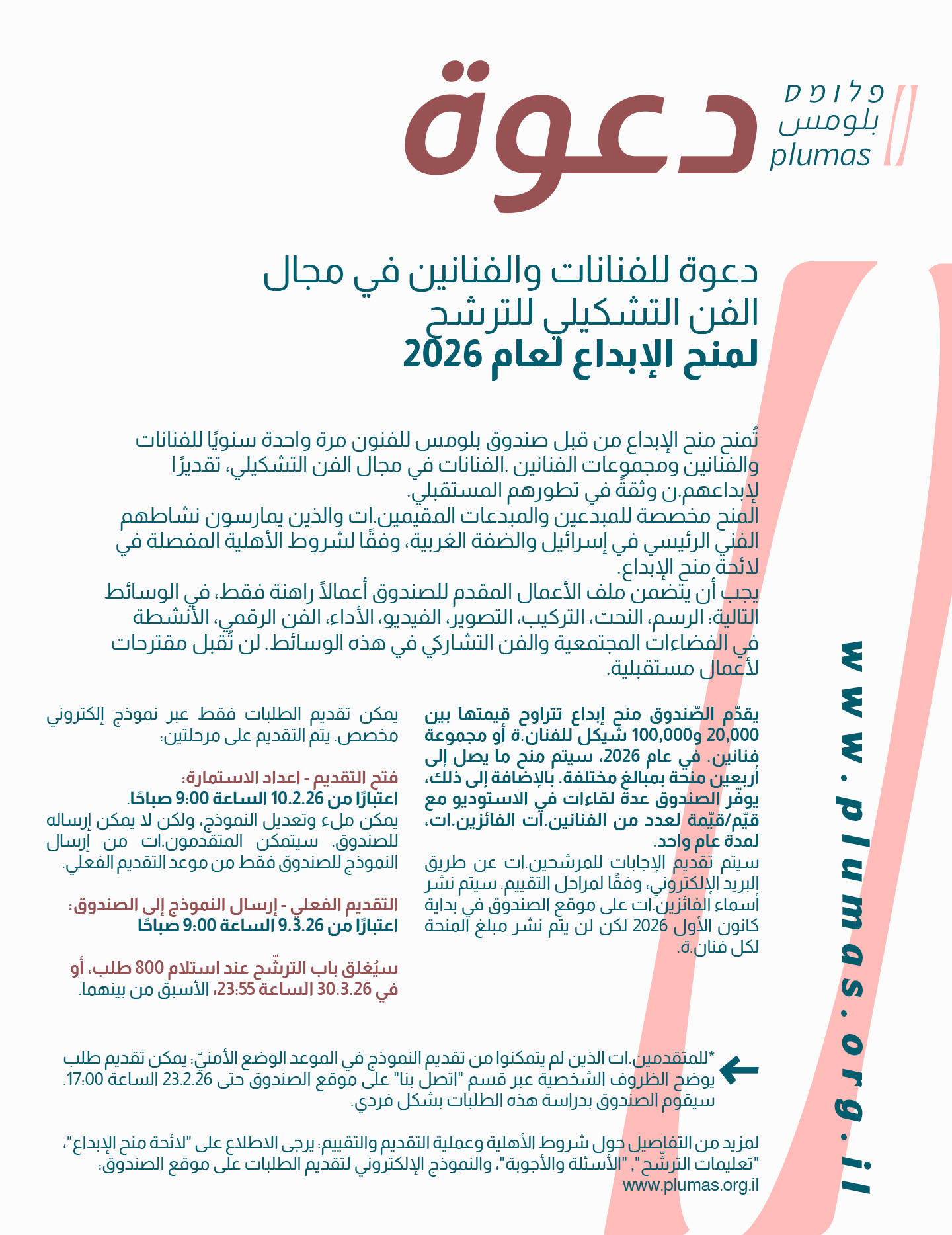 تقديم المنح الطارئة للفنانين.ات الذين تم إخلاوهم.ن من منازلهم.ن بسبب الحرب بالتعاون مع صندوق “أومانوت عم شاحر- الفنّ منذ اللحظة الأولى” واتحاد الفنانين التشكيليين.
