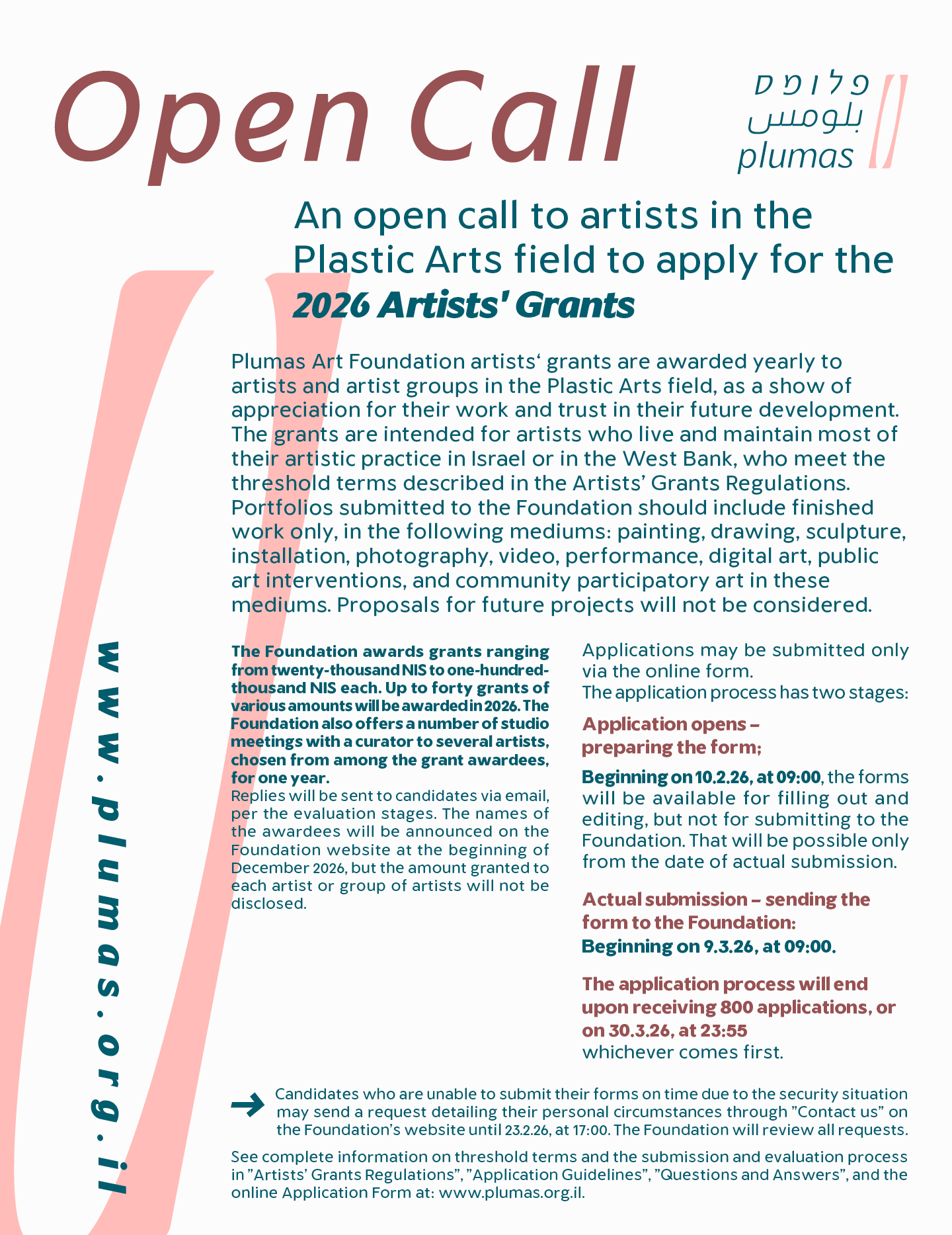 The Foundation’s evaluation process comprises two stages: an online submission and a personal meeting with a curator for those selected to receive the grant. The process is long and complex (see Artist Grants Regulations מעבר לקובץ PDF for details). Consequently, the grants are meant not to fulfill immediate needs but to be used in the year following the submission.